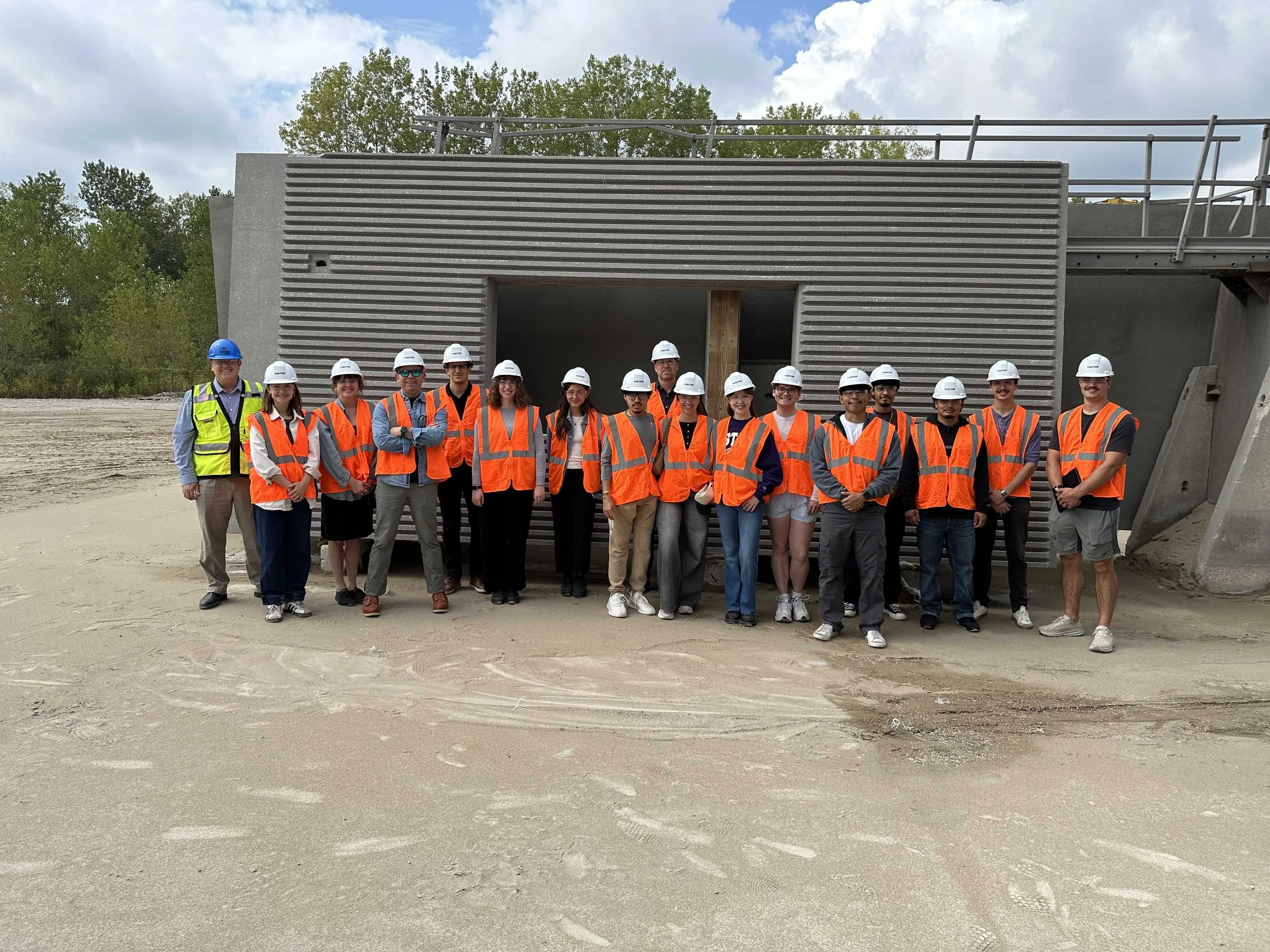 Due to the nature of the Resilience Hub project, our architecture students are challenged with incorporating real-world construction methods into their buildings while in the design phase. Dirk McClure visited us at KCDC to present an overview of what is possible with modern precast building facades. In order to better inform them in their design process, our studio was privileged with being able to tour the local Enterprise Precast Concrete plant, getting first-hand experience of how this construction method is used to balance budget and design. Our studio got insight into multiple parts of the production process of precast concrete, gaining a better understanding of their options when using this method of construction in their current projects and beyond. Precast construction allows for cheaper solutions when designing a reusable framework for resilience hubs, and it can help to reduce the amount of coordination required during the construction processes. Students are challenged to take advantage of these benefits while incorporating them into conceptual designs.