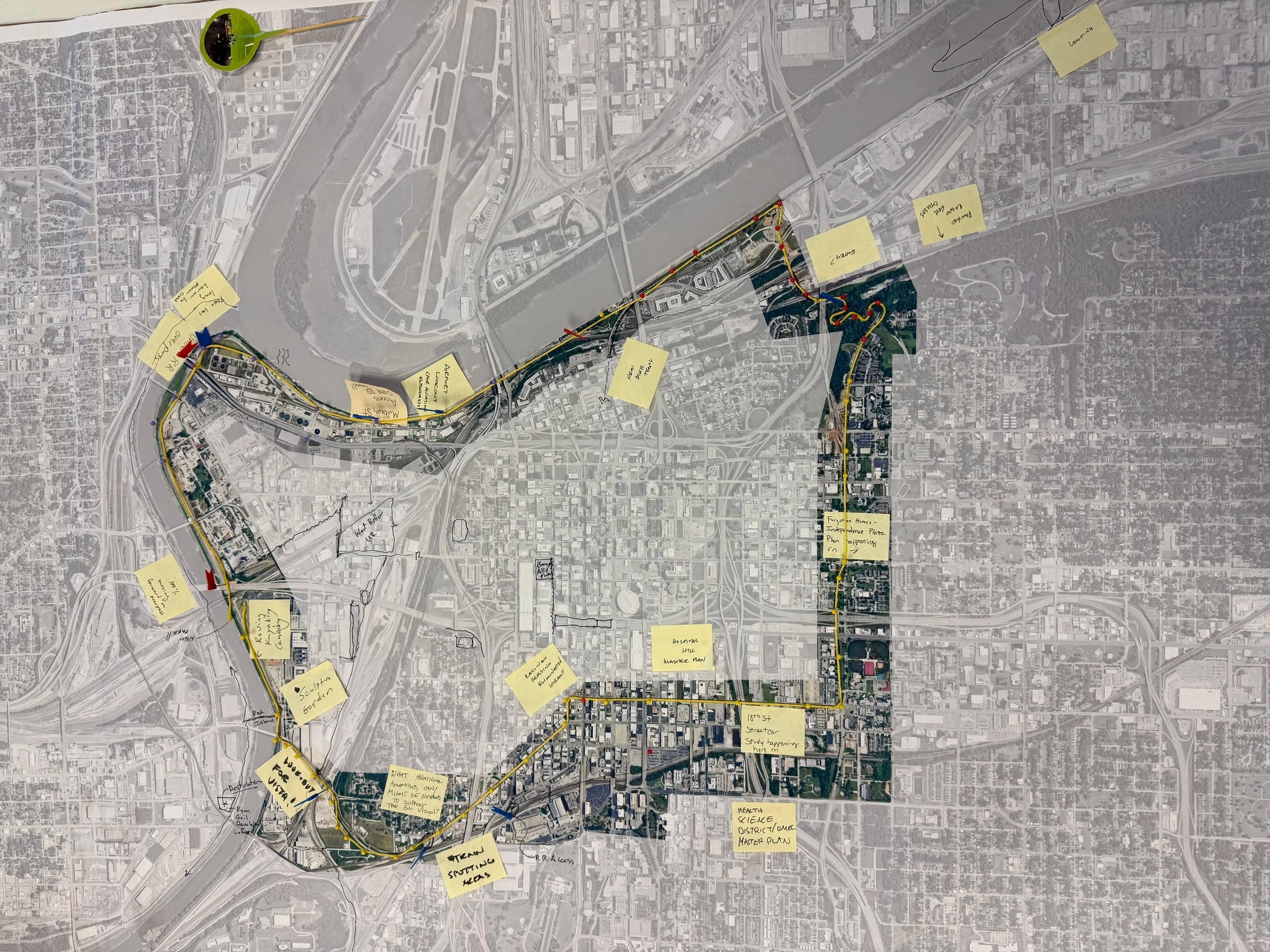 This semester, KCDC is studying the Greenline, a 10-mile urban trail that will loop around Downtown KC. This week, we went to Blip Coffee for our Community Kick-Off Event, where we presented our research across five focus areas: Community Connectivity, Social Equity, Environmental and Ecological Systems, Economic and Urban Impact, and Public Space Use and Character. Representatives from BNIM, the Downtown Council, BikeWalkKC, the Levee Betterment Project, and others attended to listen to our presentations and help us deepen our research.