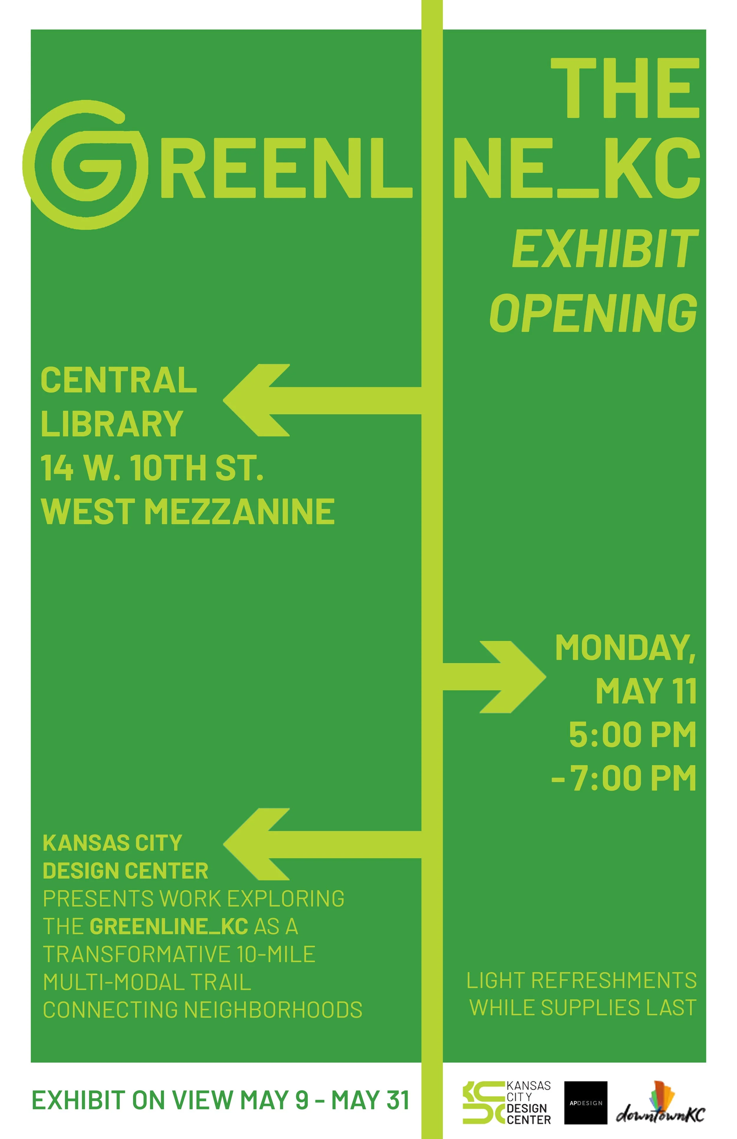 Join us for the opening of the Greenline_KC exhibit on May 11th from 5:00 - 7:00PM at the Central Library.!