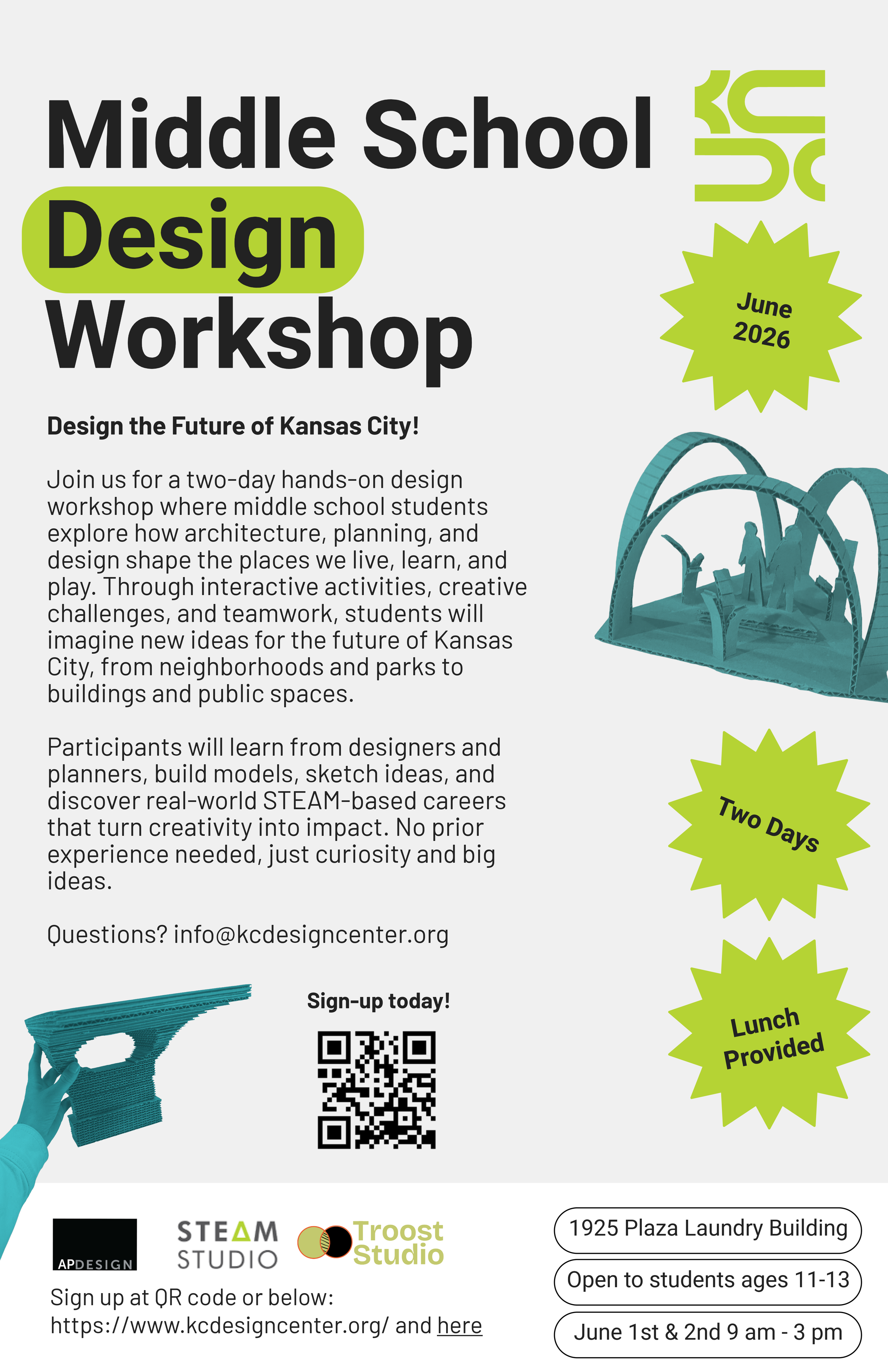 Middle School Design Workshop Monday, June 1, 2026 9:00 AM 09:00 Tuesday, June 2, 2026 3:00 PM 15:00 Google Calendar ICS Register Here:https://kansascitydesigncenterworkshop.eventbrite.com